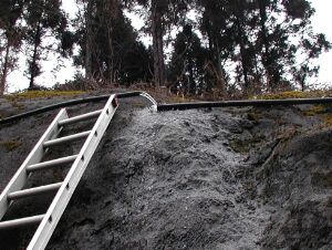 「まずは水源地点検行をしようか...。」と車を走らせ かけて吃驚仰天。 倶楽部に引き込む最後のジョイントが外れて、流れる水 は道路の高い壁を濡らし写真の如くなのである。 高度6メートル。 残念ながら上から手が届く位置ではないために、一番 難儀な場所なのである。 午前中を費やし、水が再びほとばしる頃には 開拓民 夫婦は疲れ果てて座り込む。 |