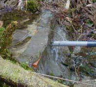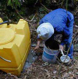 | (1)流れに、レンガとモルタルでダムを作る (2)タンクに取り込み、泥などを沈殿させる (3)タンクが動かないように止める |
